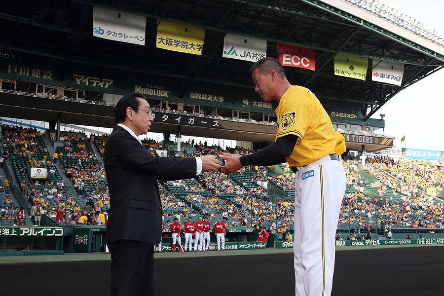 25日(水)、阪神甲子園球場での広島東洋カープ戦の試合前に、7月3日(火)の対中日ドラゴンズ戦(阪神甲子園球場)で、公式戦通算3000塁打を達成した福留孝介選手の球団表彰を行いました。