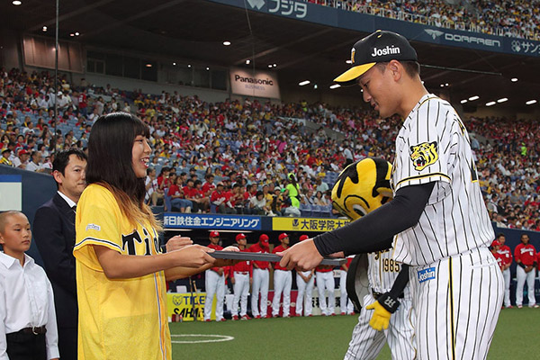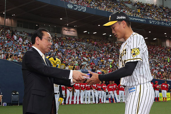 球団選定5月度月間最優秀選手に秋山拓巳選手が選ばれており、8月14日(水)、京セラドーム大阪での広島東洋カープ戦の試合前に表彰式を行いました。