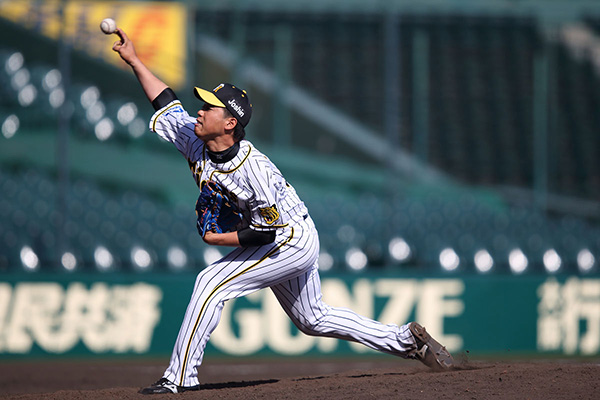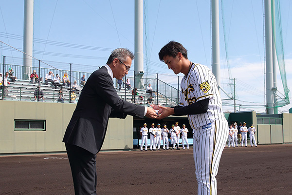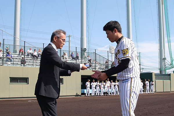 球団選定ファーム年間最優秀選手の投手に伊藤和雄選手、野手に板山祐太郎選手が選ばれ、3日(水)、三菱重工名古屋との練習試合前に阪神鳴尾浜球場にて表彰式を行いました。