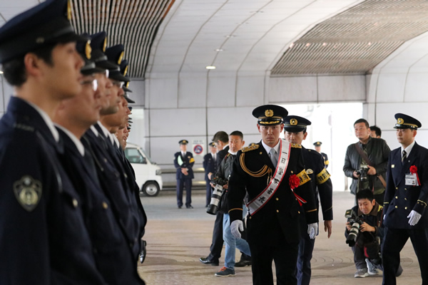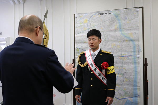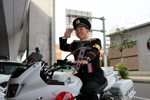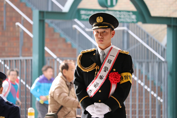 一日警察署長の委嘱状を交付された糸原選手は「年末特別警戒発隊式」に参加し、通常点検や車両点検を見守り、「私は、バッティングや守備でチームの勝利に貢献できる野手を目指しており、チームメイトの信頼やファンの皆様の期待に応えられるよう、常に全力で勝負します。警察官の皆様は、それぞれのポジションで、管内の治安維持のため、昼夜問わず、職務に励んでおられると思います。西宮市民の皆様が平穏に年末を過ごし、明るい新年を迎えられるよう、より一層頑張ってください」と警察官の皆さんに訓示しました。