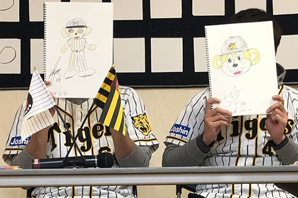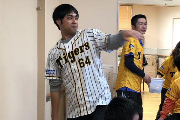 選手たちは、質問コーナーやクイズ、ストラックアウト対決、トラッキーの似顔絵対決や糸引き対決などのゲームで、施設利用者の皆さんと楽しい時間を過ごしました。
