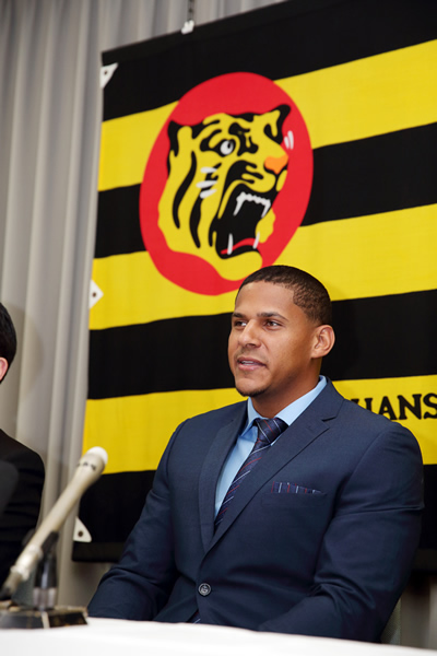 29日(火)、球団事務所(兵庫県西宮市)にて、先日入団が決まりましたジェフリー・マルテ選手の入団会見を行いました。