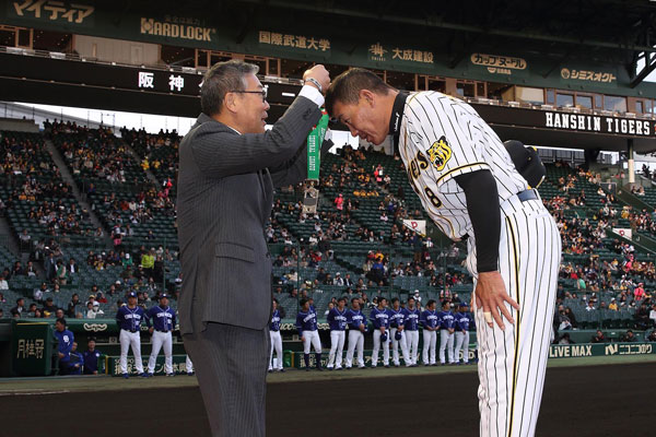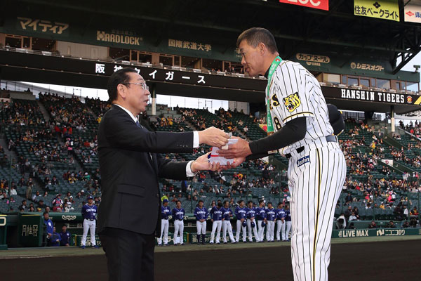 12日(金)、阪神甲子園球場での中日ドラゴンズとの試合前に、4月6日(土)の対広島東洋カープ戦(MAZDA Zoom-Zoomスタジアム広島)で、公式戦通算1000打点記録を達成した福留孝介選手の連盟表彰が行われました。