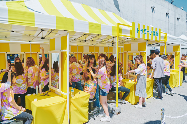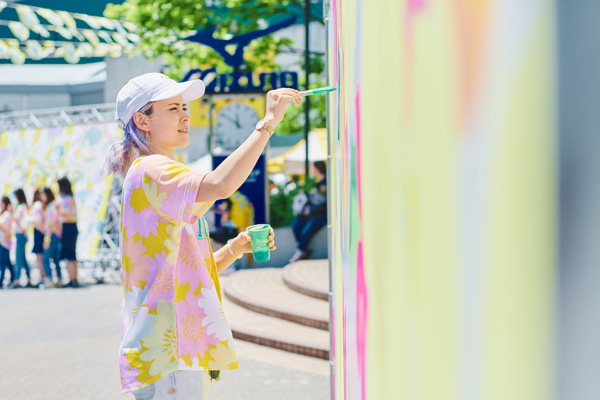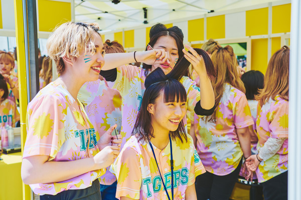 球場外周では、ガールズフェスタならではの体験ブースで「トラ耳ヘア」が出来るヘアアレンジや、選手パネルと撮影ができる選手フォトパネルブース、TORACOスイーツが楽しめるキッチンカーなど勢揃い。また、ゲストにはフジテレビ系リアリティー番組「テラスハウス」に出演し、現在はグローバルに活動中の画家・壁画アーティスト、フランキー・スィーヒさんを迎え、TORACOライブペインティングのパフォーマンスで外周を可愛く演出しました。