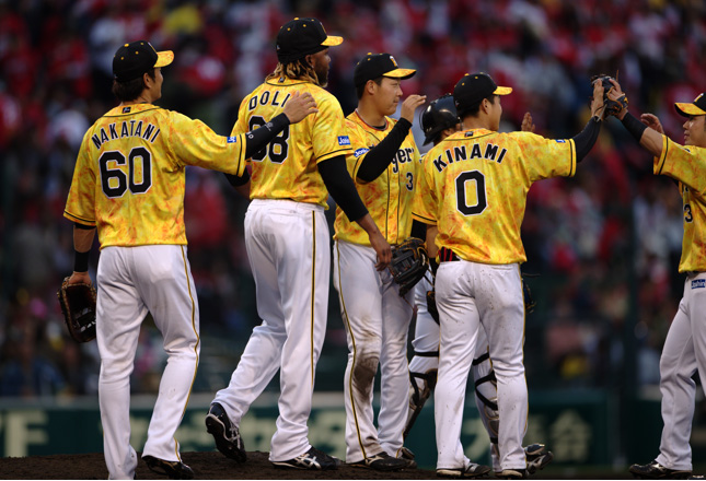 - 選手が黄色の「ウル虎の夏2019ユニフォーム」を着用。