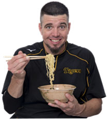 | 矢野監督のガーリックステーキ丼 1,300円→1,200円 | 広島出身!上本の汁なし担々麺700円→600円 | チョコ好き上本のストロベリー バナナクレープ 600円→500円 |