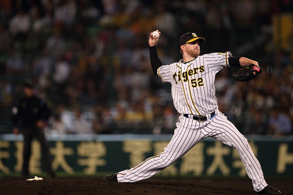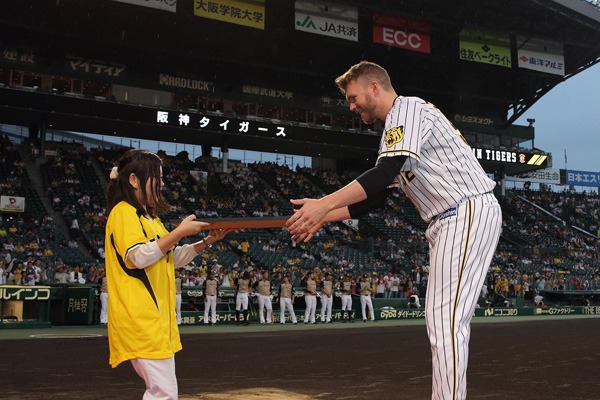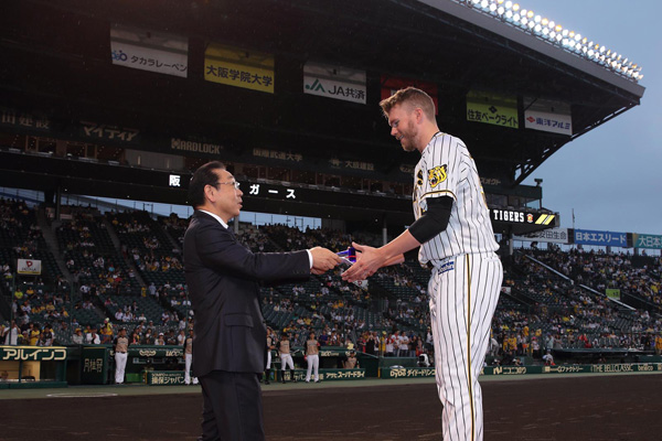 球団選定5月度月間最優秀選手にピアース・ジョンソン選手が選ばれ、6月7日(金)、阪神甲子園球場での北海道日本ハムファイターズ戦の試合前に表彰式を行いました。