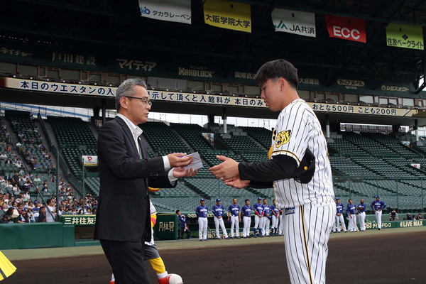 球団選定ファーム5月度月間最優秀選手に馬場皐輔選手が選ばれ、14日(金)、阪神甲子園球場で開催したウエスタンリーグ対中日ドラゴンズ戦の試合前に表彰式を行いました。受賞した馬場皐輔選手には、清水奨常務取締役より賞品と記念品が授与されました。