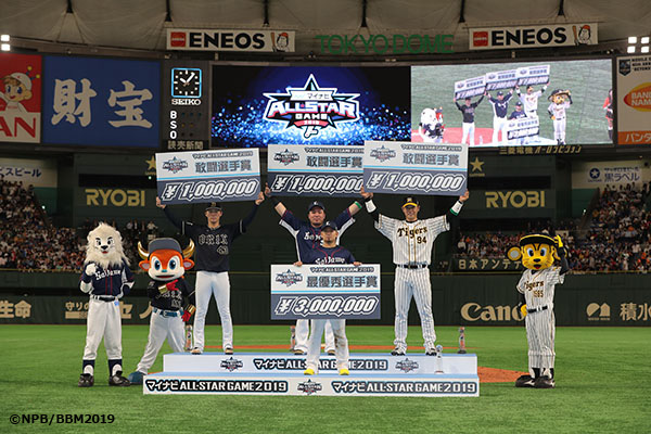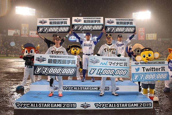 この試合で近本選手はフル出場、オールスター史上2人目のサイクル安打を達成し、見事第二戦の最優秀選手賞に選ばれました。また2日連続でホームランを放った原口選手は2試合を通してファンに夢と感動を届けた選手として「マイナビ賞」と期間中にTwitter上で最も注目され、オールスターゲームに貢献した選手として「Twitter賞」を受賞しました。