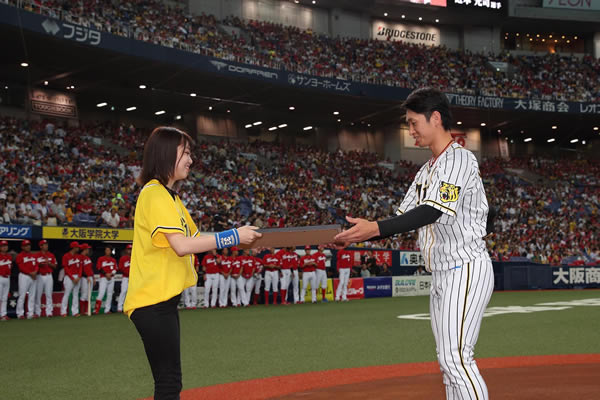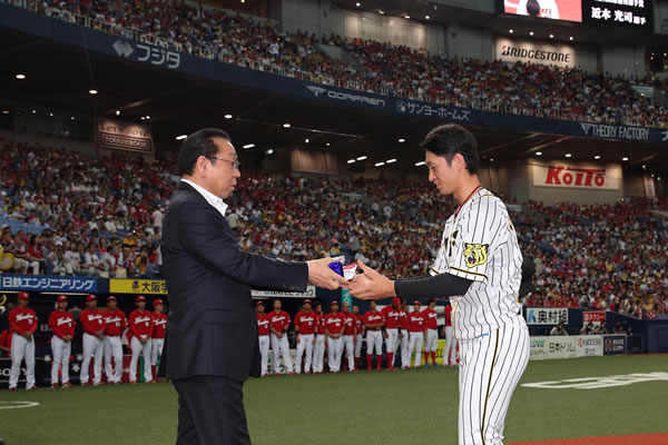 球団選定7月度月間最優秀選手に近本光司選手が選ばれ、10日(土)、京セラドーム大阪での広島東洋カープ戦の試合前に表彰式を行いました。