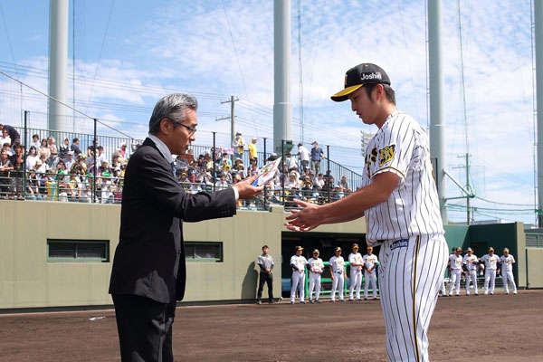 球団選定ファーム8月度月間最優秀選手に飯田優也選手が選ばれ、25日(水)、阪神鳴尾浜球場で開催したウエスタンリーグ 対福岡ソフトバンクホークス戦の試合前に表彰式を行いました。