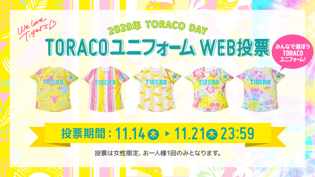2020シーズンに阪神甲子園球場で開催予定のTORACO DAY※1におきまして、女性入場者限定で「TORACOユニフォーム」のプレゼントが決定いたしました!※2