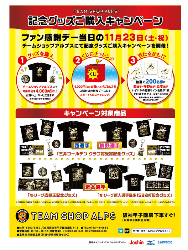 チームショップアルプスでは、11月23日(土・祝)ファン感謝デー2019当日に記念グッズご購入キャンペーンを開催いたします。記念グッズのご購入金額4,000円(税込)ごとに1回、店舗付近の特設ブースにてスピードくじにチャレンジいただきます。抽選で200名様に西選手、梅野選手、近本選手のいずれかお好きな選手の直筆サイン色紙1枚が、その場で当たります。