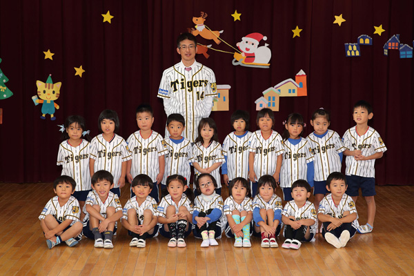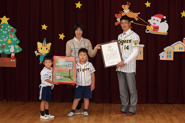 園より西宮市からの感謝状を送られた能見選手は、園児たちと玩具で一緒に楽しんだり、記念写真を撮るなどして園児たちとふれあい、また、園児からは御礼に歌のプレゼントをいただきました。