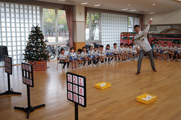 11日(水)、能見篤史選手が西宮市の幼稚園を訪問し、子どもたちへの玩具「マジックナインベースボール」の寄贈式を行いました。