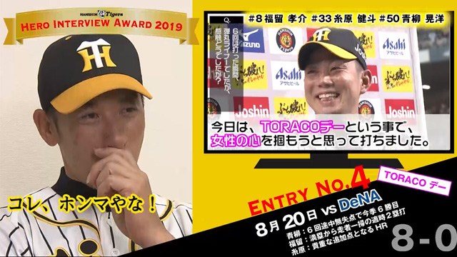 球団公式モバイルサイトでは、矢野監督自らが審査委員長となり、2019年シーズンのNo.1ヒーローインタビューを決めていただく動画コンテンツ「ヒーローインタビューアワード2019」後半を本日配信いたしました。
