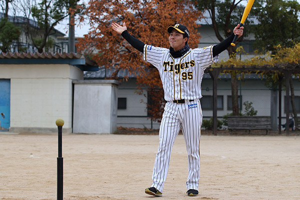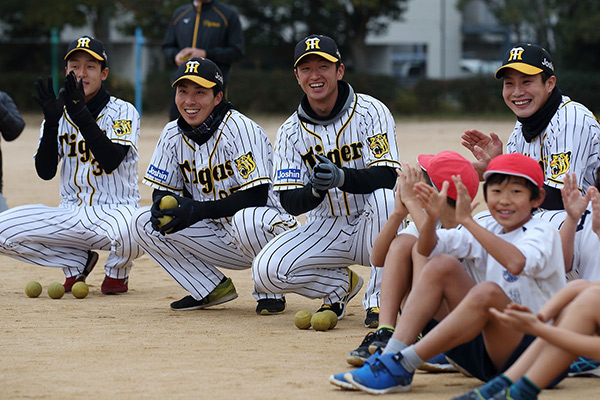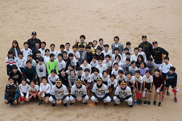 19日(木)、近本光司選手、小幡竜平選手、木浪聖也選手、片山雄哉選手が「伊丹市立摂陽小学校」を訪問、ゲストティーチャーとして6年生の体育の授業に参加、約70名の児童の皆さんとティーボールを使ったキャッチボールやミニゲームなどをして楽しい時間を過ごしました。