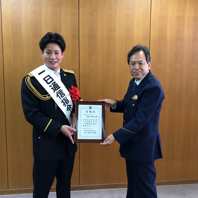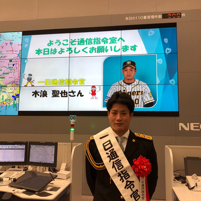 10日(金)、木浪聖也選手が兵庫県警本部にて「兵庫県警一日通信司令官」を務めました。木浪選手は委嘱状を受け取ると通信司令室を視察したり、パトカー・白バイに試乗、110番の日の啓蒙活動に参加しました。挨拶では、一日通信司令官として「110番には、無駄な通報や緊急ではない通報が多いと聞きました。皆さん、適切な通報をお願いいたします。」と110番通報の正しい使い方を呼びかけ、緊急時での利用を皆様にお願いしました。