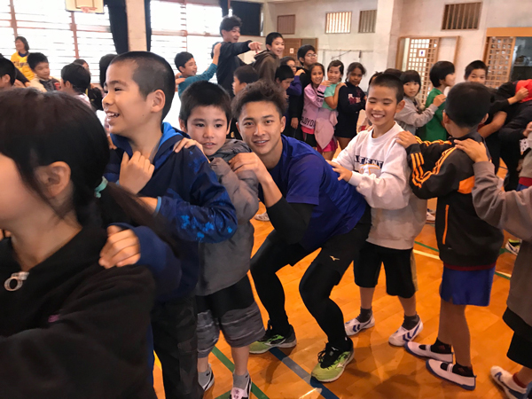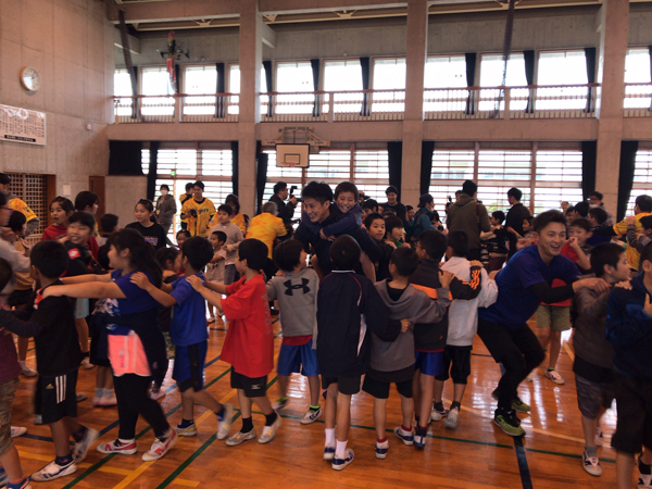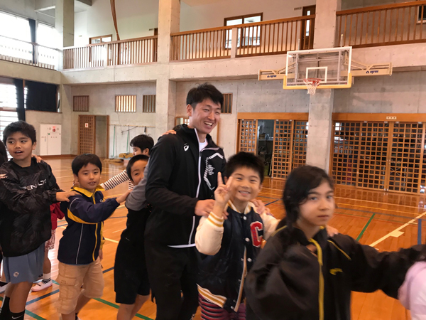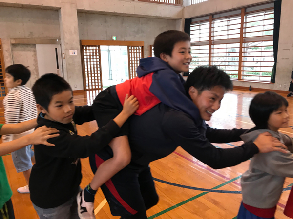 松田小学校の児童の皆さんと松田幼稚園の幼児の皆さん約160名からの温かい歓迎を受けた選手たちは、児童の皆さんからの質問に答えたり、じゃんけん列車で交流しました。その後、児童代表からお礼の挨拶をいただき、最後に全員で記念撮影を撮って、1時間ほどの短い時間でしたが、楽しい時間を過ごしました。
