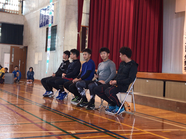 - 近本選手、木浪選手、熊谷選手、島田選手、植田選手が宜野座村立松田小学校を訪問