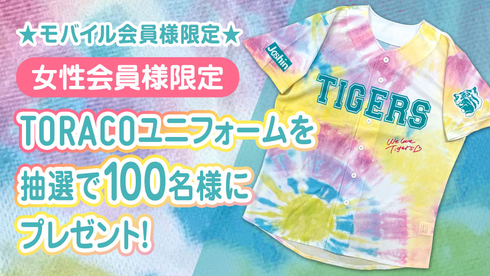 本日より、球団公式モバイルサイトをご利用いただいている女性会員様を対象に、8月14日(金)から16日(日)の対広島戦でご来場の女性に配布されたTORACOユニフォームを、抽選で100名様にプレゼントいたします。