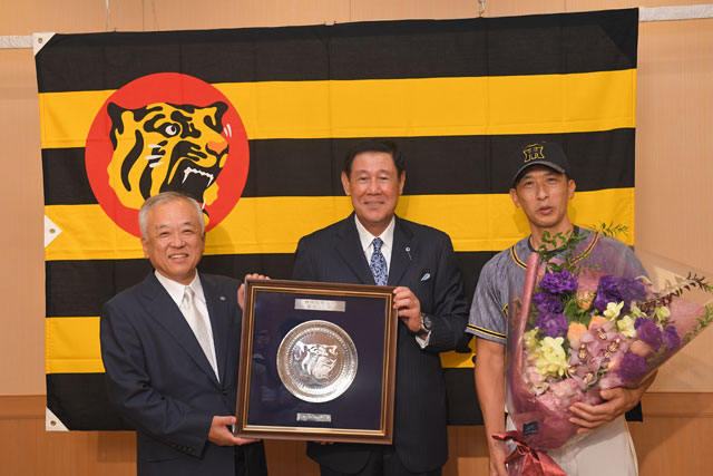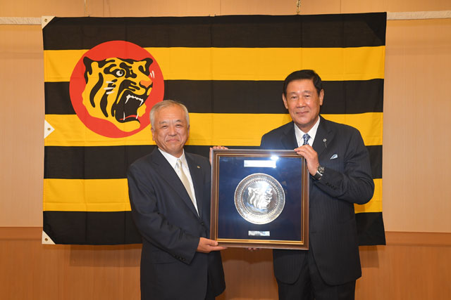 阪神タイガースでは、田淵氏の野球殿堂入りを称え、藤原崇起オーナー、矢野燿大監督より記念の盾と花束を贈呈いたしました。