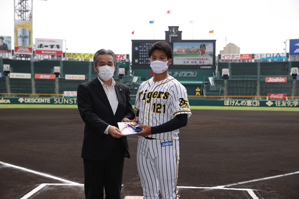 球団選定ファーム8月度月間最優秀選手に石井将希選手が選ばれ、18日(金)、阪神甲子園球場で開催したウエスタンリーグ 対中日ドラゴンズ戦の試合前に表彰式を行いました。