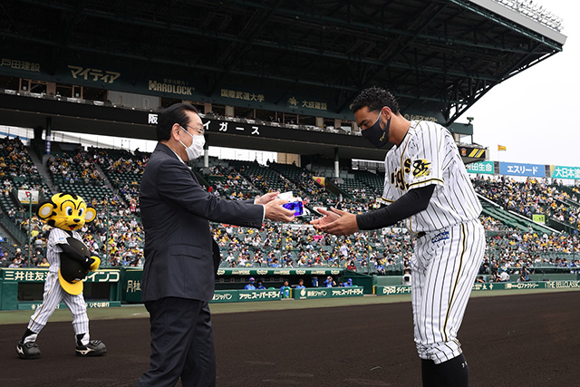 球団選定9月度月間最優秀選手にロベルト・スアレス選手が選ばれ、10日(土)、阪神甲子園球場での横浜DeNAベイスターズ戦の試合の前に表彰式を行いました。