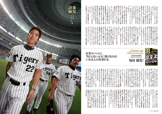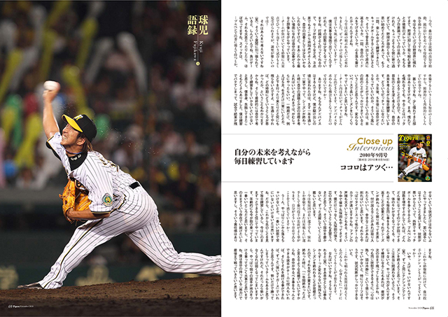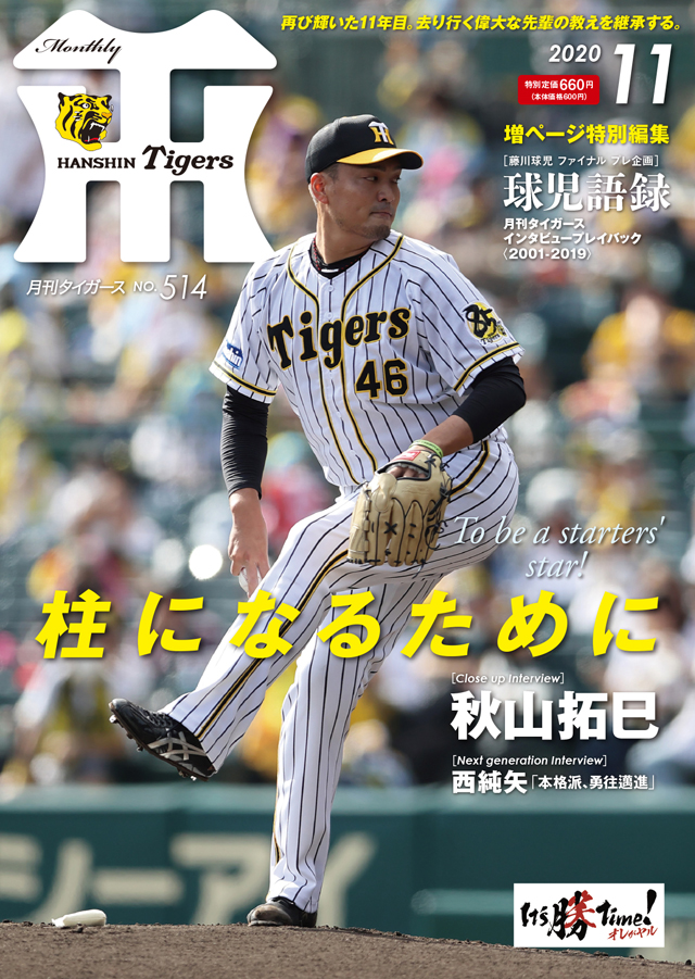 月刊タイガース11月号の表紙&特集インタビューは、プロ11年目となる今シーズン、安定感のあるマウンドさばきで順調に勝ち星を積み重ねてきた秋山拓巳投手。ファーム選手インタビューには、期待のルーキー右腕、西純矢投手が登場します。また、今号では、引退セレモニーを間近に控える藤川球児投手の特別企画として、阪神タイガース入団以来のインタビュー記事を再編集し、貴重な秘蔵写真とともに振り返る「球児語録」を巻末に掲載。ファンにとっては見逃せない、増ページの特別編集でお届けします。