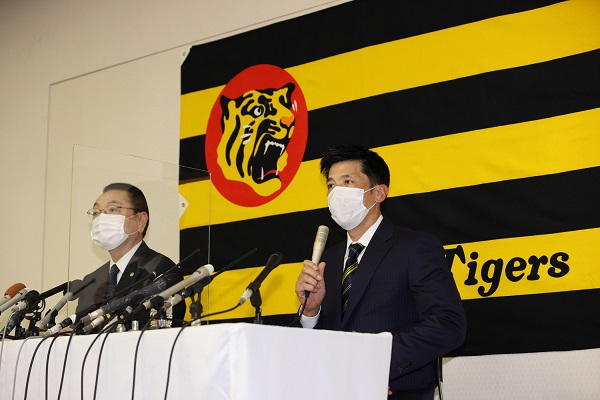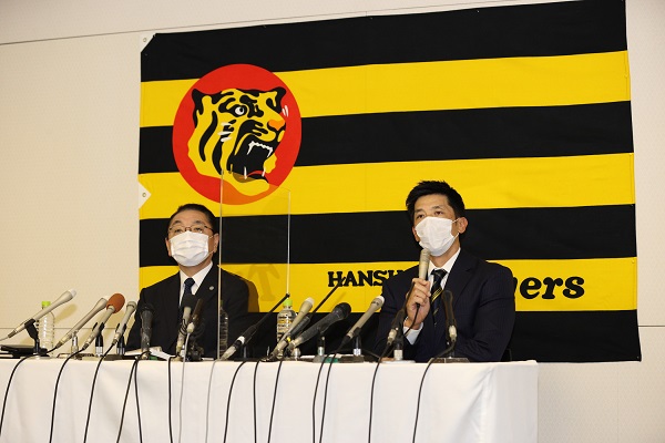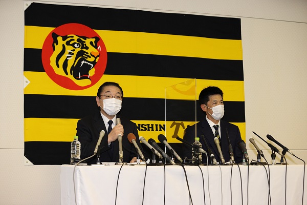 12日(木)、阪神電鉄本社(大阪市)において、矢野監督が藤原オーナーへシーズン終了を報告し、その後、揚塩球団社長とともに会見を行いました。