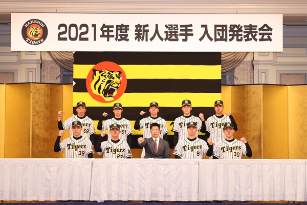 7日(月)、大阪市内のホテルにて「2021年度新人選手入団発表会」を行いました。佐藤輝明選手、伊藤将司選手、佐藤蓮選手、榮枝裕貴選手、村上頌樹選手、中野拓夢選手、髙寺望夢選手、石井大智選手、岩田将貴選手の9名が、初めて縦縞のユニフォームに袖を通し、入団の喜びや今後の目標について語りました。