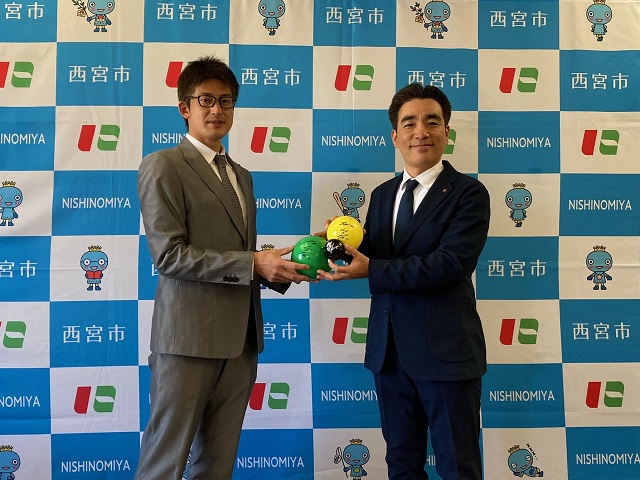 17日(木)、能見篤史選手が西宮市役所を訪問し、子どもたちへの玩具「やわらかボール」の寄贈式を行いました。