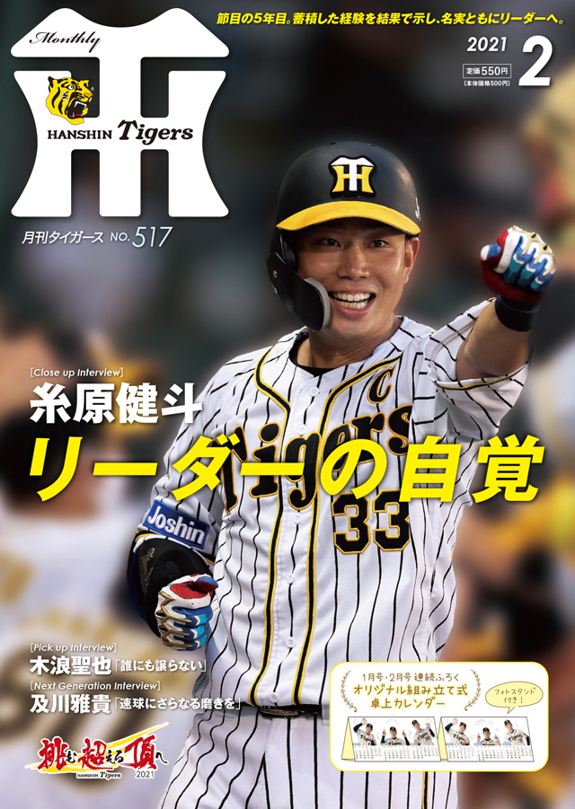 月刊タイガース2月号の表紙&巻頭インタビューは糸原健斗選手。昨シーズンは二度にわたる戦線離脱を余儀なくされ不完全燃焼に終わりましたが、新たに迎える5年目に雪辱を誓います。その他にも遊撃のポジション争い最右翼、木浪聖也選手やプロ2年目の飛躍に期待のかかる及川雅貴投手のインタビューを掲載。グラビアページでは注目のルーキーを始めとした各選手の2021年始動の様子を紹介しています。また、前月号に引き続き、センターページには、オリジナル組み立て式卓上カレンダーをとじ込み。球春への期待が高まる一冊です。