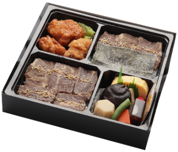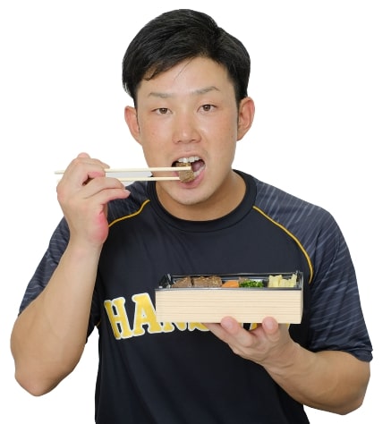 | 糸井選手好物の「チャーハン」をメインに、他にも好物であるハンバーグやコロッケをラインナップした、ボリューム満点なお弁当です! | 糸井選手好物のハラミ肉を豪快に盛り付けた味・ボリュームともに大満足な一品!お肉との相性を考え、チョレギ風サラダを添え、ヘルシーさもプラスしました! |