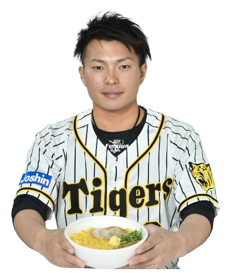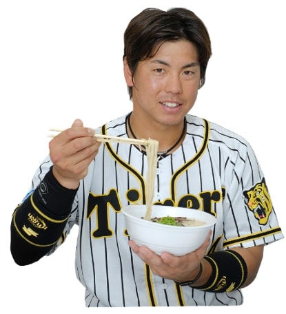 | 「かしわ飯」「高菜明太子」「とり天」など、出身である九州地方の食材を詰め込んだ幕の内弁当です。ボリュームもあって幅広い層にお楽しみいただけます! | 福岡県出身の梅野選手がプロデュースした博多ラーメンです。こだわりのあっさりスープと特注の細麺がよく絡み合います!目指せ選手コラボグルメNo.1!! |
