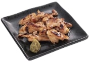 | 岩崎選手好物の鶏肉を、一度に複数の部位が味わえるように「ハラミ」と「せせり」をミックス!岩崎選手の地元静岡県をイメージした茎わさびがこだわりのポイントです! | |