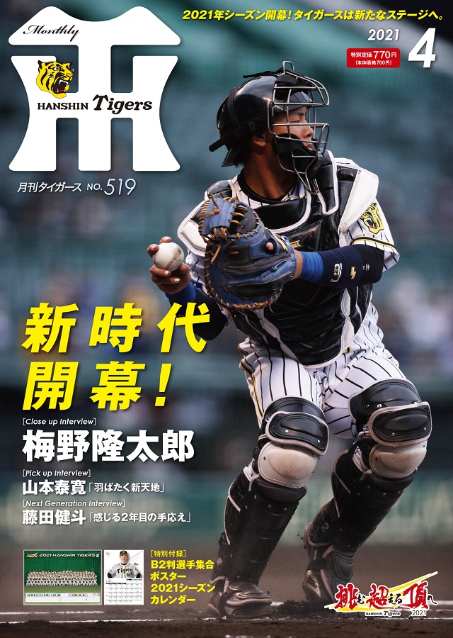 いよいよ2021年シーズンが開幕。月刊タイガース4月号では、新たな背番号を背負いファン期待のシーズンに臨む、梅野隆太郎選手が表紙&巻頭インタビューに登場します。その他にも注目選手のインタビュー記事や話題のルーキー、佐藤輝明選手のオープン戦での活躍ぶりなどをグラビアでたっぷりとご紹介。さらに開幕号特別付録として2021シーズンカレンダーとB2判選手集合ポスター付きで、開幕モード全開でお届けします。