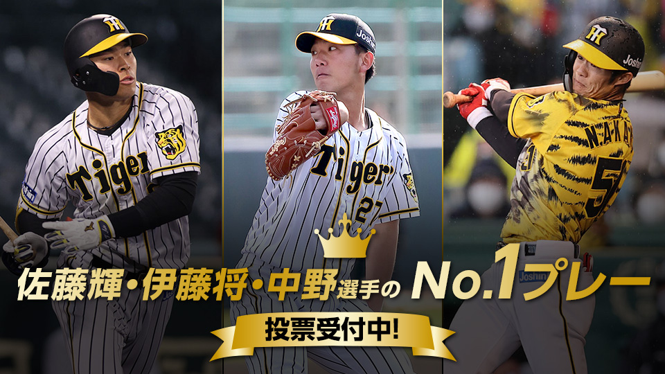 公式モバイルサイトでは、佐藤輝明選手・伊藤将司選手・中野拓夢選手特集企画の一貫として、No.1プレー投票を本日より開始します。公式モバイルサイト実況速報担当が選定した交流戦までのプレーの中から、「これだ!」と思うものに投票してください。