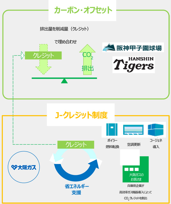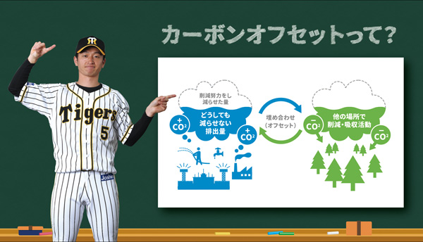 | 阪神甲子園球場では、太陽光発電の利用や節電施策の実施、球場内照明のLED照明への切替えなどにより、CO2排出量の削減に努めています。 今般、阪神タイガース主催による公式戦6試合を、J-クレジット制度を活用することで、当該試合の開催に伴うCO2排出量を実質ゼロとする「カーボン・オフセット試合」とします。 | 【カーボン・オフセットの概要】![]() |