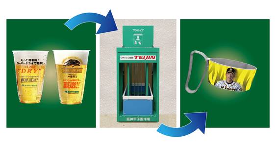 | 2012年から帝人フロンティア㈱と共同で、球場内で提供しているポリエステル製のビール用プラスチックカップを回収し、再生ポリエステル繊維や樹脂にリサイクルする取組みを行っています。リサイクル再生ポリエステル製品は、来場されるお客さまへの配布物などに活用しています。 | ![]() |