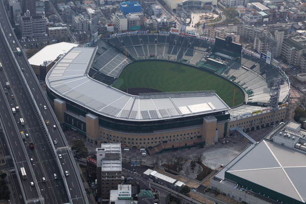 | 2007年~2009年に実施したリニューアル工事に伴い、新しくなった銀傘に設置された太陽光発電装置により、年間193,000kwhを発電しています。これは、阪神タイガースが1年間に阪神甲子園球場で行うナイトゲームで使用する照明の電力量に相当し、火力発電に比べてCO2排出量を年間で約150トン削減することが可能です。 | ![]() |