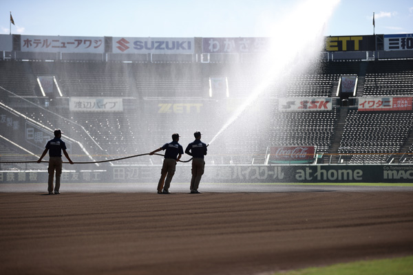 | 球場敷地内の井戸からくみ上げる井戸水に加えて、2009年のリニューアル工事以降、銀傘に降る雨水を地下タンクに貯め、グラウンドへの散水やトイレの洗浄水として使用しており、これにより、球場が年間に使用する水量(約66,600㎥)の約65%を賄っています。 | ![]() |