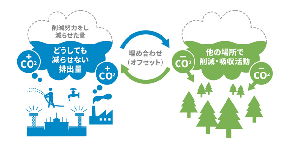 日常生活や経済活動などにおいて避けることができないCO2等の温室効果ガスの排出について、できるだけ排出量が減るよう削減努力を行ったうえで、どうしても排出される温室効果ガスについて、排出量に見合った温室効果ガスの削減活動に投資すること等により、排出される温室効果ガスを埋め合わせるという考え方です。