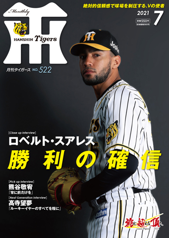 月刊タイガース7月号の表紙&巻頭インタビューは、開幕から不動のクローザーとして圧倒的なパフォーマンスを発揮し続けるロベルト・スアレス投手。クールな表情で160㎞オーバーを連投する守護神が、チームへの思いや後半戦の抱負などを語ります。またピックアップインタビューには、果敢かつ攻撃的な走塁で貴重な働きを見せている熊谷敬宥選手が登場。グラビアでは2位に終わったセ・パ交流戦を振り返ります。