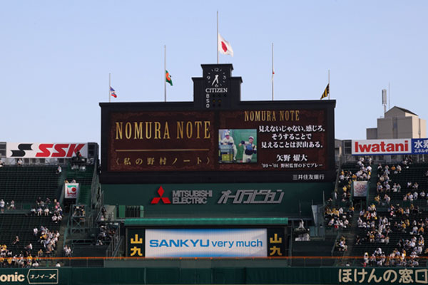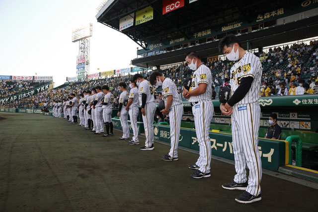 この日半旗を掲げた阪神甲子園球場では、試合前には哀悼の意を表し、追悼映像を放映。その後、両軍・関係者・観客の皆様で黙祷を捧げました。