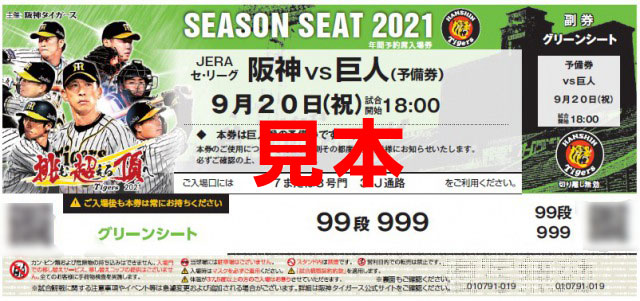 9月20日(月・祝)【巨人戦 予備日】…[阪神VS巨人(予備券)9月20日(祝) 18:00]