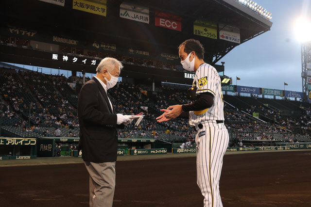 球団選定7・8月度月間最優秀選手に青柳晃洋選手が選ばれ、8日(水)、阪神甲子園球場での対東京ヤクルトスワローズ戦の試合前に表彰式を行いました。