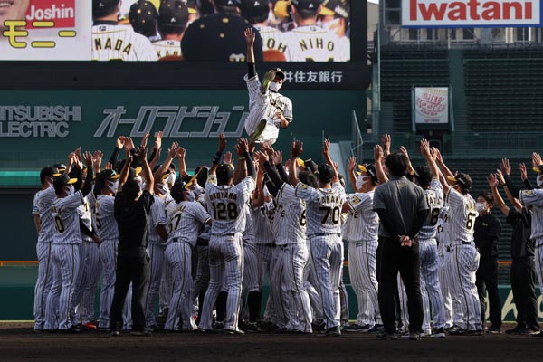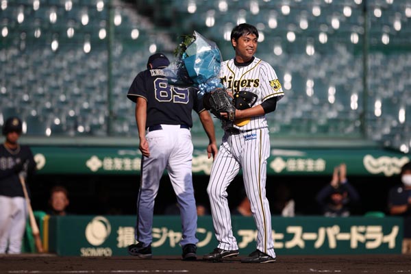 登板を終えた桑原選手には、オリックス・バファローズを代表して小林ファーム監督、阪神タイガースを代表して平田ファーム監督から花束が手渡されました。