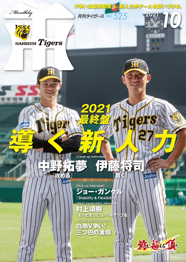 月刊タイガース10月号の巻頭特集は、中野拓夢選手、伊藤将司投手のフレッシュなルーキーコンビ。今シーズンの躍進に少なからず貢献している二人ですが、ここまでに感じたプロの手ごたえを語り、終盤戦に向けた力強いメッセージを届けます。その他にもジョー・ガンケル投手、村上頌樹投手のインタビューを掲載。グラビアページでは、いよいよ大詰めを迎えているペナントレースでの優勝に向けた奮闘ぶりを、臨場感あふれる写真でたっぷりと伝えています。