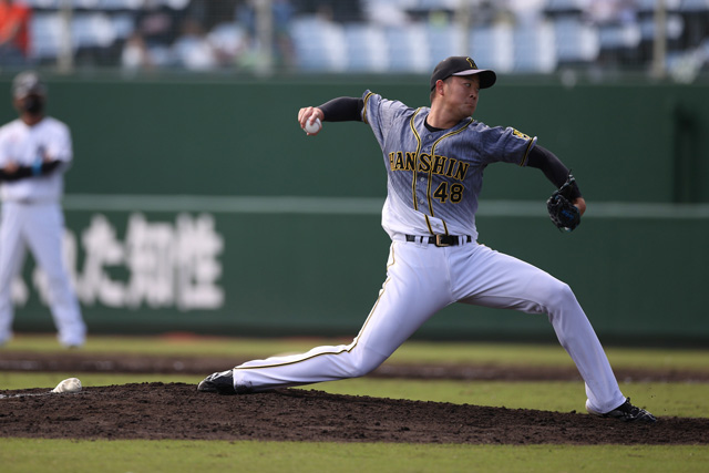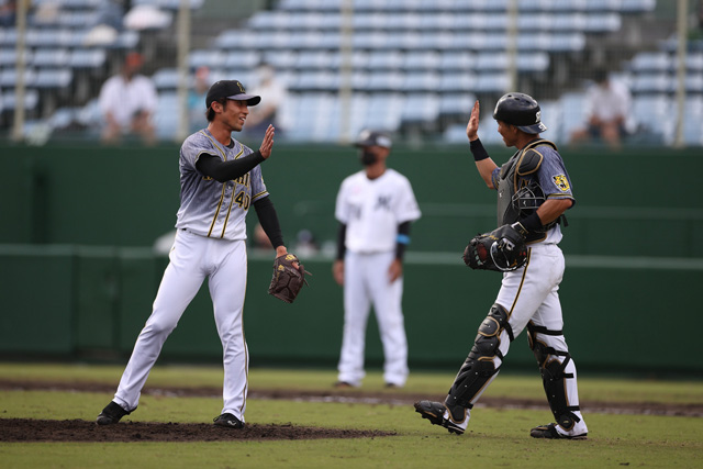 タイガース先発の村上頌樹選手は6回2失点の好投をみせ、その後藤浪、齋藤、岩田将、尾仲の4選手が無失点に抑えました。2点リードを許していた9回表、先頭の髙山選手がツーベースヒットを放つと続く榮枝選手がタイムリーヒットで1点を返し、その後1アウト1・3塁の場面、遠藤選手がレフトへのタイムリーヒットで同点に追いつくと、その後相手の失策で1点を取り、勝ち越しに成功しました。